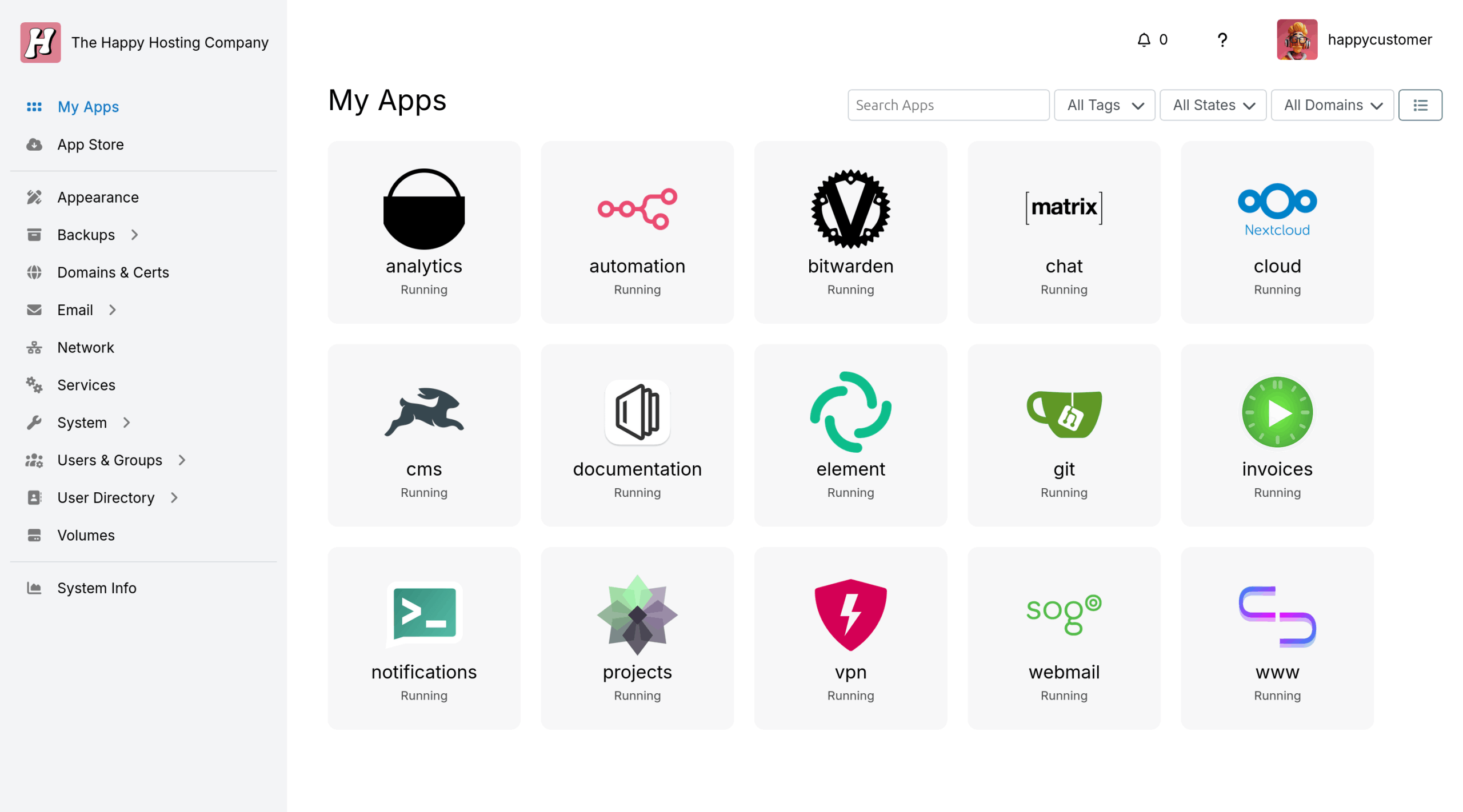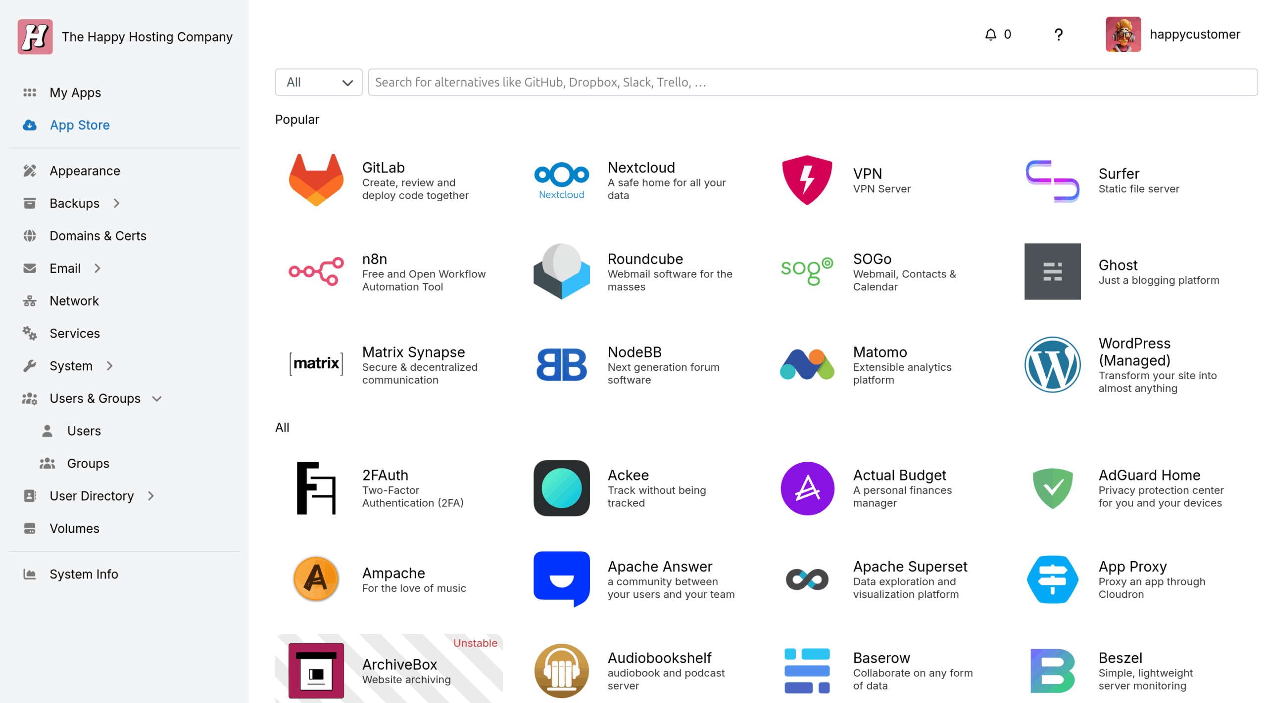 Here’s where the fun begins. The built-in App Store offers a curated collection of (mostly) open-source tools ready to be installed in seconds. Need a project manager, a CRM, or a shared calendar? Just click, enter subdomain, confirm, and you’re done – everything is pre-configured, secure, and automatically updated. Discover new apps, experiment freely, and build your perfect stack – all without touching a terminal.
